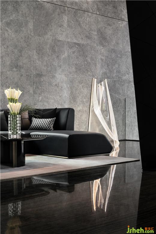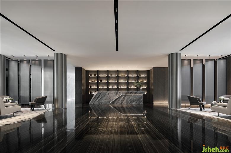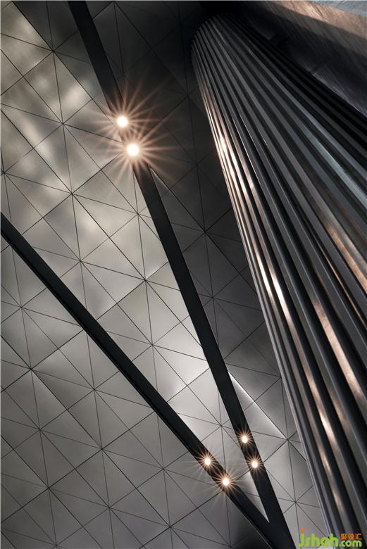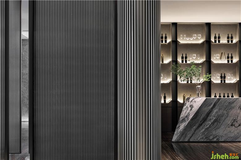 光線從墻面穿孔鋁板透出,運用幾何線條元素、與山石吊飾造景形成獨特韻味,疏影斑駁靈動。摒棄多余的陳設,以極具現代感的藝術裝置去迎合空間本身的靈動,搭出極具視覺沖擊力的多元層次,完成空間的藝術化表達。