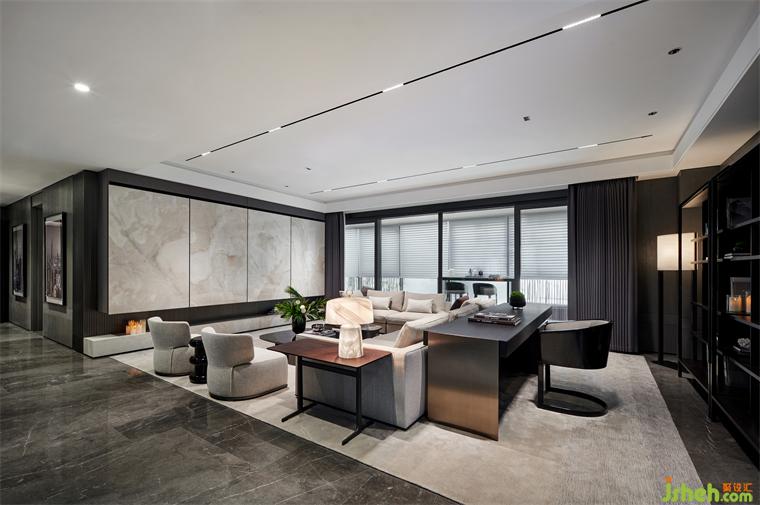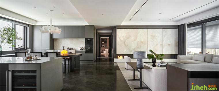 在城市源點(diǎn),汲取土地的稟賦肌理,演繹未來(lái)生活方式,南京樣板房設(shè)計(jì)客餐廳使用面積達(dá)到80多㎡,橫廳設(shè)計(jì),大面積的落地窗將南京河西磅礴大氣的城市景致盡收眼底。