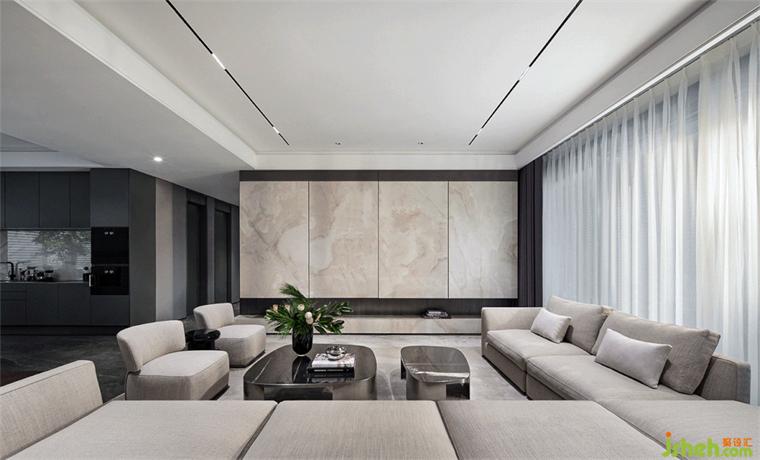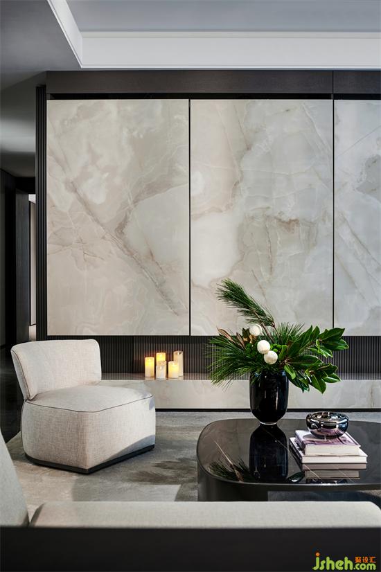 客餐廳地面全部采用星耀灰天然大理石密縫拼接,南京樣板房設(shè)計(jì)空間以布藝沙發(fā)和石材茶幾搭配,呈現(xiàn)契合南京城市風(fēng)貌的空間體驗(yàn)。