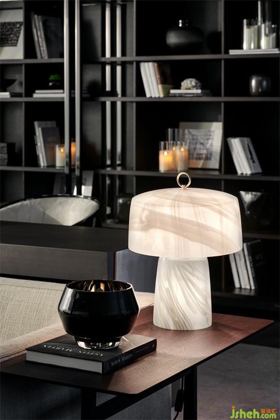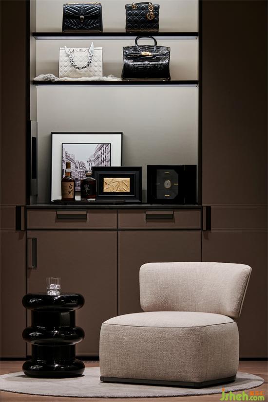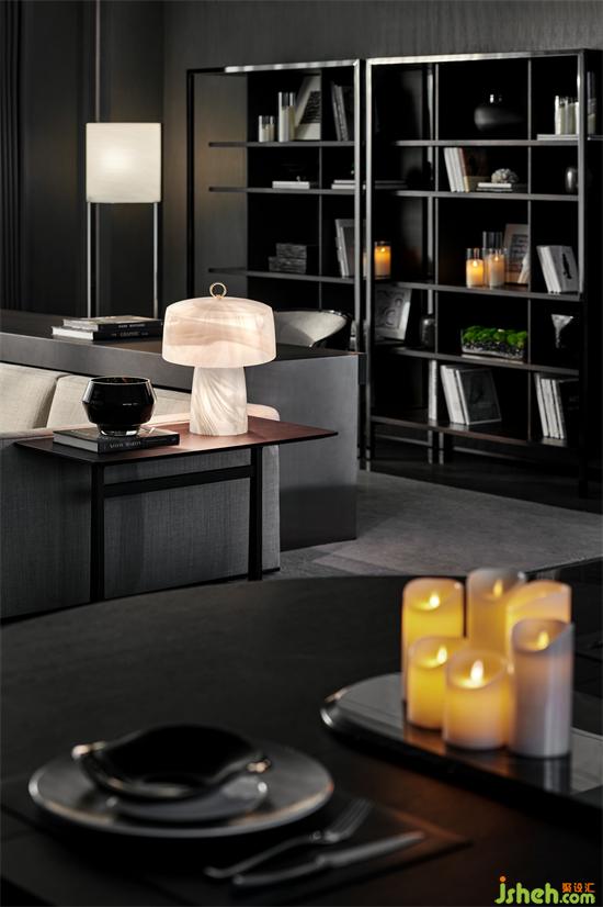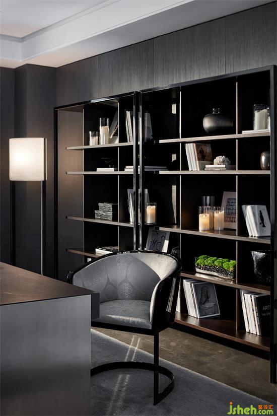 沙發(fā)背后的閱讀區(qū)域,質(zhì)感奢華的桌子,比例協(xié)調(diào)的展示架均呈現(xiàn)出一種內(nèi)斂沉靜的氛圍。墻面實(shí)木飾面紋理細(xì)膩與造型獨(dú)特的邊幾搭配,塑造出清雅自然的基調(diào)。