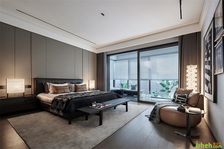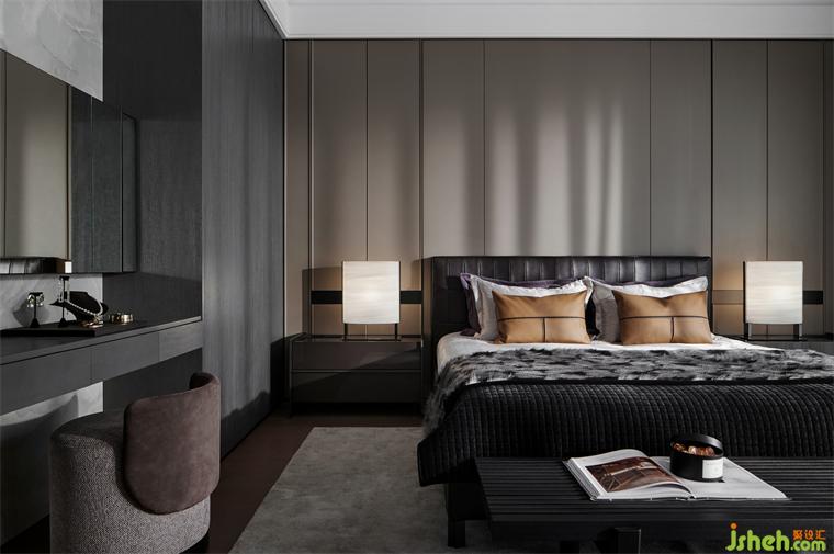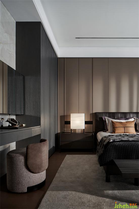 三間朝南套房臥室,雙開門主臥帶超大衣帽間,南京樣板房設(shè)計于人文中探索奢華,高端定制的拼花實木復(fù)合地板,皮質(zhì)的衣柜背板和抽屜里面,邂逅棲霞的匠心。