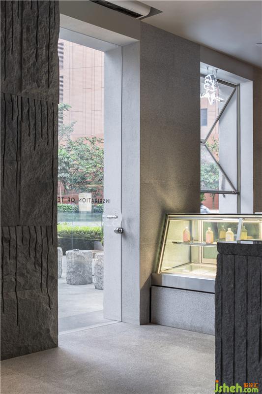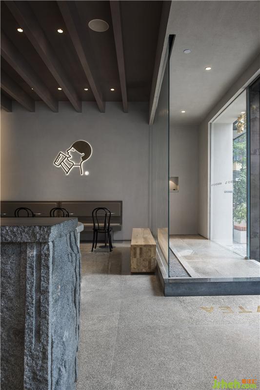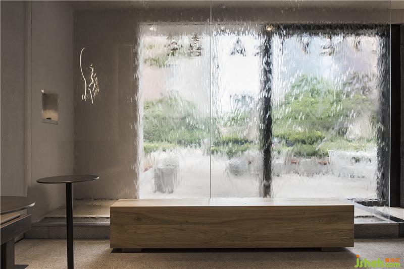 At the entrance, we designed a curtainof glass and wateras a partition.The flowing water makes the space more dynamic andfull ofvariations, and form a contrast of movement and stillnesswith the roughnaturalstones, which addsan OrientalShanshui charm to the space.Large areas in the space are austere and undecorated, leaving customers moreroom for imagination.