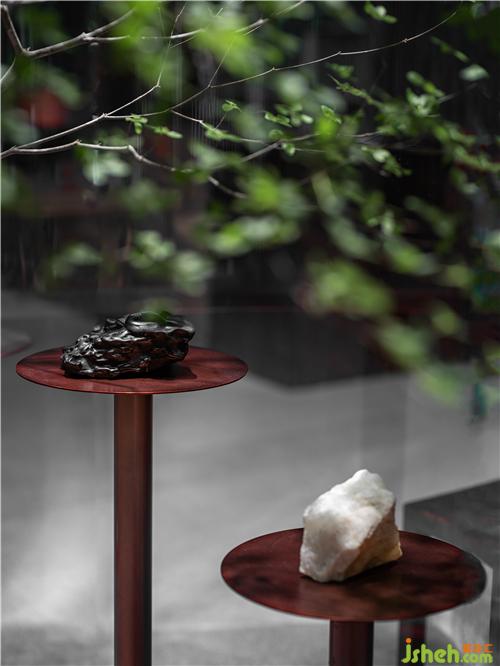 空間隨處可見不加修飾的石材和木材——有些以家居的形態(tài)體現(xiàn),粗糙的鑿面被保留下來,構(gòu)成空間自然粗糲的質(zhì)感;而有些則用風雨做它的鑿刀,自然沖刷的圓潤或凹凸,以不同體量,貫穿其中,營造游園的體驗;而木頭則坦誠地舒展著它們來自天然的紋路,安放在每一次的觸感當中。室內(nèi)設計師