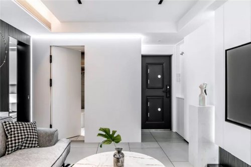 沙發(fā)背景墻中間的內(nèi)凹造型設(shè)計(jì)采用了質(zhì)感的黑鋼材質(zhì),與灰色的主色調(diào)形成鮮明對(duì)比。兩側(cè)則是設(shè)計(jì)了通頂?shù)碾[形柜體,巧妙地與整個(gè)空間的護(hù)墻木板融為一體,既滿足了業(yè)主的收納需要,更成為空間的點(diǎn)睛之筆。隱形門的設(shè)計(jì),在視覺上切斷了內(nèi)外兩個(gè)世界的聯(lián)系,室內(nèi)設(shè)計(jì)師使客廳整體造型統(tǒng)一的同時(shí),也保證了內(nèi)部空間的私密和舒適自在。