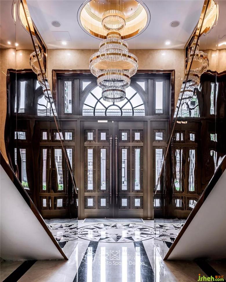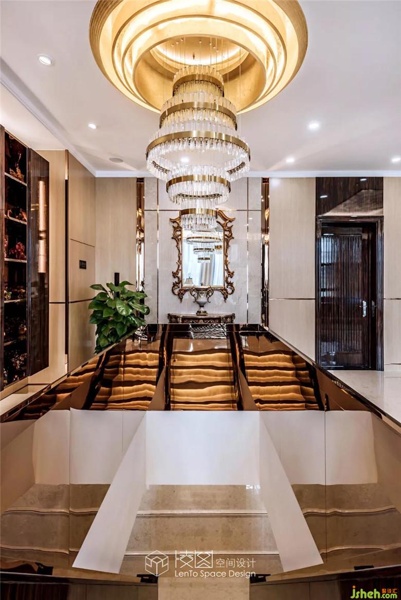 推門而入,挑高的空間格局朗闊大氣,在融入了黃銅元素的水晶吊燈的映襯之下光韻流轉(zhuǎn),從容間呈現(xiàn)著高貴的氣質(zhì),燈光與自然光影相互描摹,為這個空間鍍上一層經(jīng)久不散的溫煦柔光。