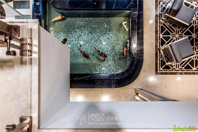 三層中廳,無(wú)論從材質(zhì),造型,色調(diào),分區(qū)還是Art Deco元素的運(yùn)用上來(lái)看,都緊密地與二層空間相互呼應(yīng)。憑欄俯視,可以望到二層共享觀景區(qū)的群魚(yú)相戲,這種呼應(yīng)的虛與實(shí),顯與隱相互作用,形成視覺(jué)與區(qū)域之間的互動(dòng)。