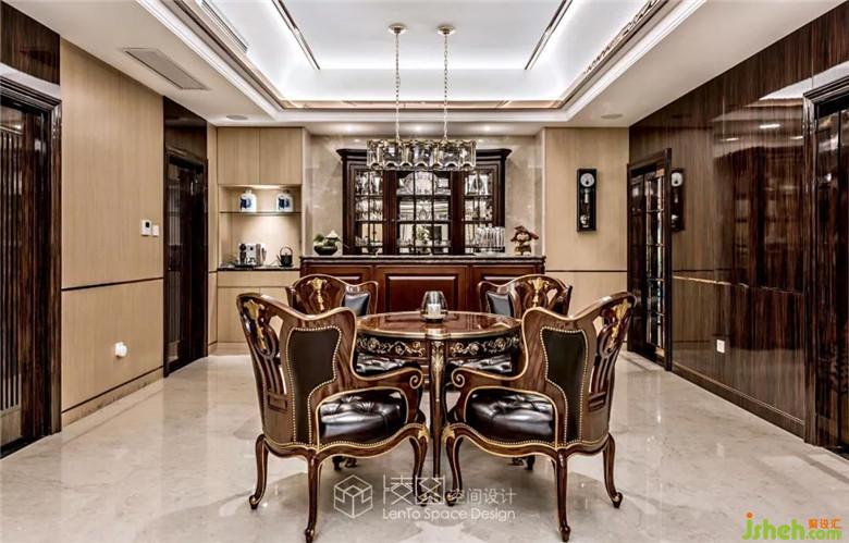 中廳與用餐區(qū)和吧臺(tái)品酒區(qū)分別列于同一水平線上,設(shè)計(jì)師充分利用原建筑的空間層次,通過(guò)頂面設(shè)計(jì)造型和燈帶的走向,采取明暗交疊、突出重點(diǎn)的手法豐富空間感,使得三個(gè)不同的功能區(qū)域既相互呼應(yīng)而又相對(duì)獨(dú)立。