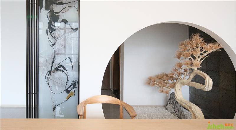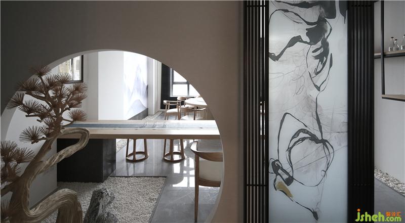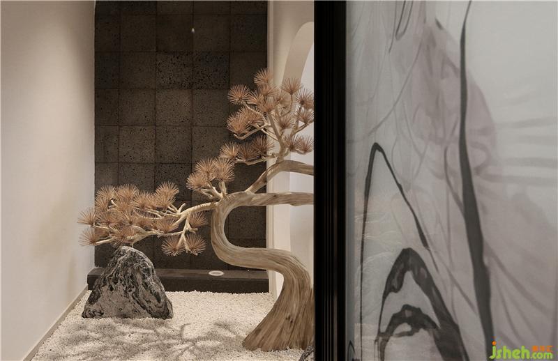西樵山曾是一個(gè)火山口,設(shè)計(jì)師在入門(mén)左側(cè)的干景區(qū)背景墻上運(yùn)用了火山石這一材質(zhì),與前側(cè)的景觀石、強(qiáng)調(diào)禪意的干景松樹(shù)形成互動(dòng),使精致的空間增添了一份粗獷。圓拱鏤空墻身為茶臺(tái)提供了透景,營(yíng)造了優(yōu)雅的氛圍。