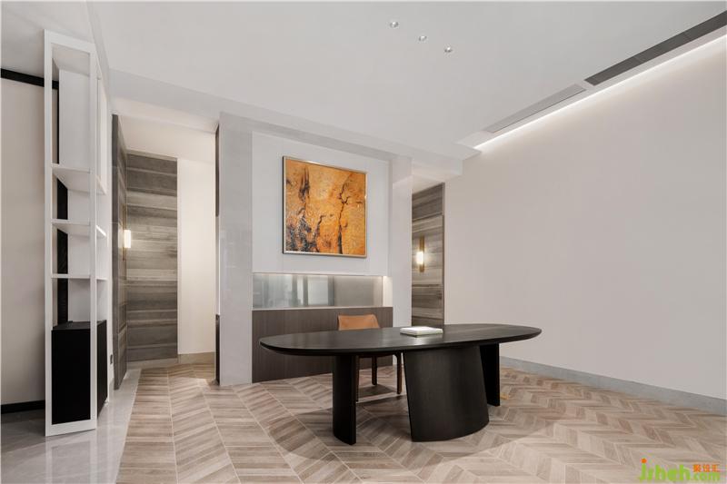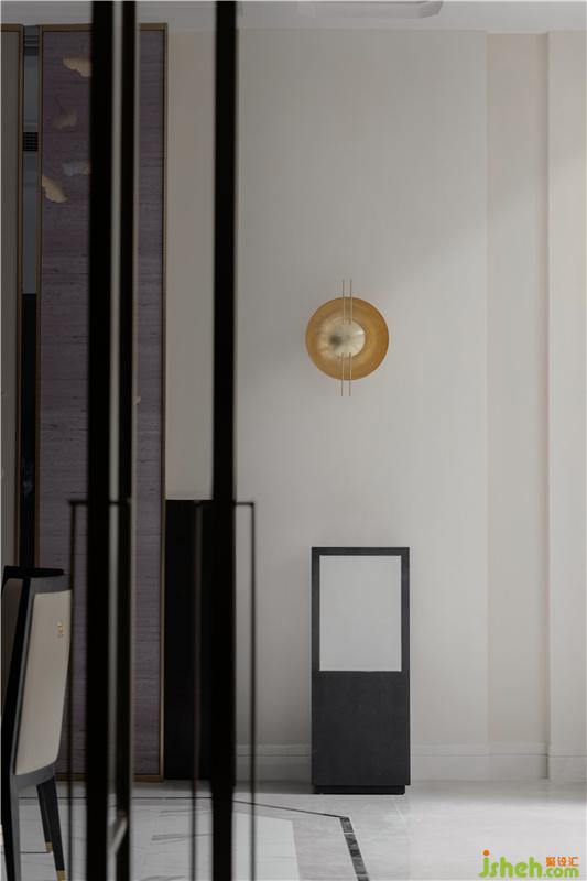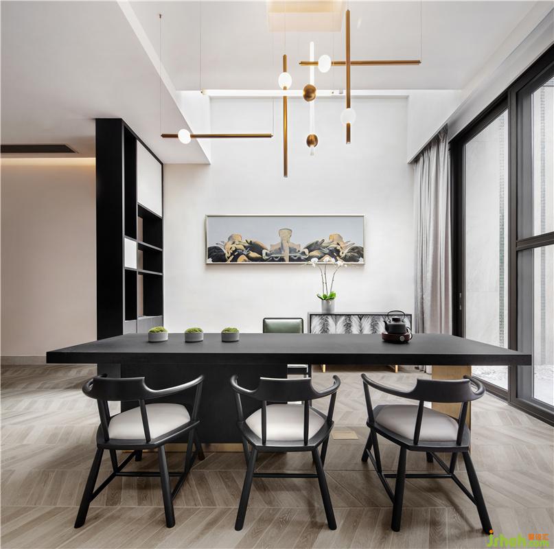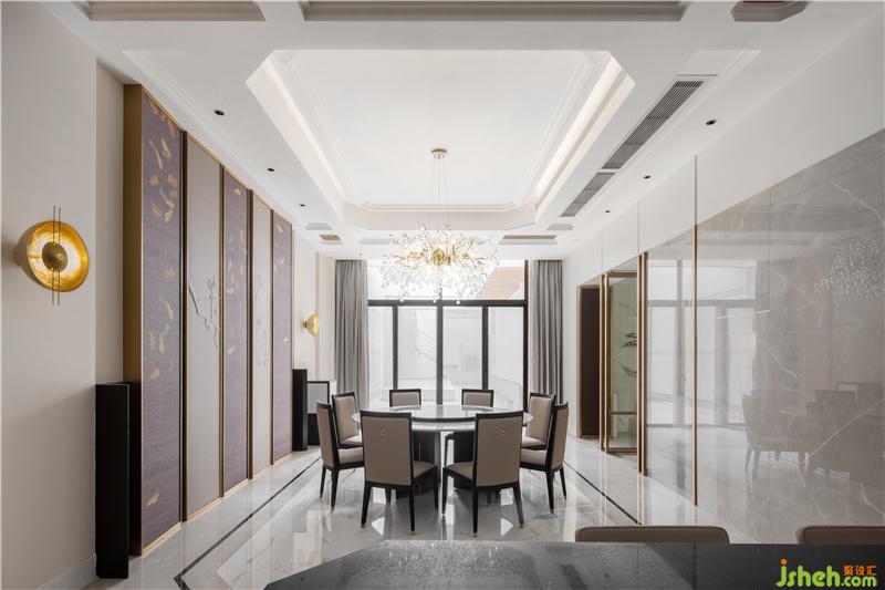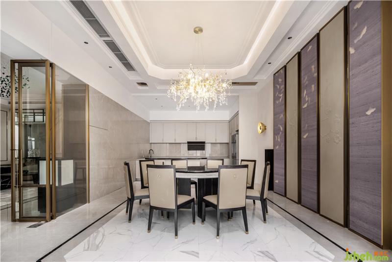 與會(huì)客廳相連的餐廳位置,則繼續(xù)沿用了會(huì)客廳中的主要設(shè)計(jì)風(fēng)格,由現(xiàn)代設(shè)計(jì)手法簡(jiǎn)化而來(lái)屏風(fēng)造型,再配以與造型天花相互呼應(yīng)的地面線條,大氣但不失情調(diào)的餐廳空間躍然眼前。