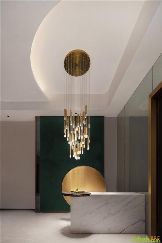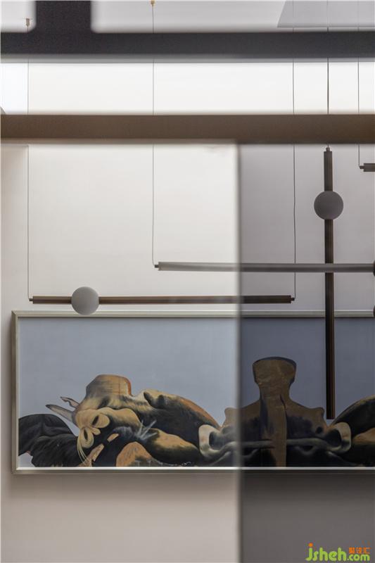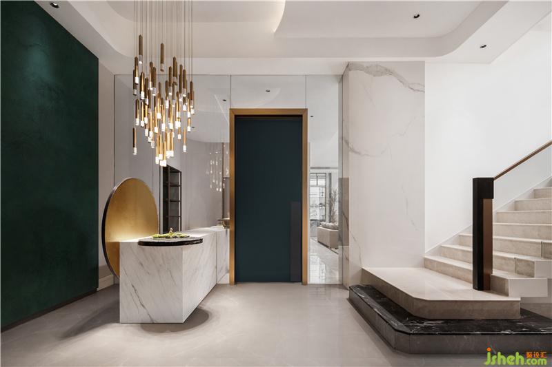 與會(huì)客廳相連的過(guò)道是整個(gè)地下一層的緩沖區(qū)域,貫穿右側(cè)的吧臺(tái),讓空間得到了延伸,同時(shí)兼具導(dǎo)向意義。由于負(fù)一層層高達(dá)到了4.6米,所以樓梯步級(jí)特別長(zhǎng),因此設(shè)計(jì)師在中間平臺(tái)處做了一個(gè)設(shè)計(jì)轉(zhuǎn)換,既打破了長(zhǎng)樓梯帶來(lái)的心理壓力,同時(shí)增添了設(shè)計(jì)的趣味性。
