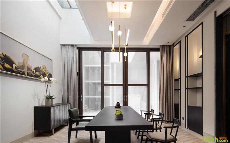 兼具了茶室與娛樂(lè)功能的書房空間,可理解為男主人緊張工作與放松娛樂(lè)接待好友的專屬天地,設(shè)計(jì)師在此空間中營(yíng)造了相對(duì)較濃的中式氛圍,并在茶室上方設(shè)計(jì)有透光井,直透一層花園,讓空間得到了延伸,并打破了地下一層的封閉感,在工作與娛樂(lè)之余安靜地品茶細(xì)思,抬頭便是那片夜空或藍(lán)天。書房門口則是一個(gè)直通地面的中空小花園,陽(yáng)光可直達(dá)花園及室內(nèi),讓原本顯得雞肋的地下空間充滿生氣。