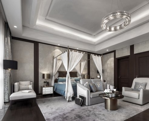 在經(jīng)過8年的沉淀,別墅設計主題最終定位為家族傳承古堡、都市新貴的生活格調(diào)游艇風。作品中最大的亮點,是設計師了解到業(yè)主非常喜歡收藏紅酒,因此大膽在原建筑結(jié)構(gòu)上進行改造,通過脫換架空的技術(shù),打造了一個800㎡地下空間,不管從功能、格局規(guī)劃、藝術(shù)性、設計價值而言,都堪稱完美。臥室看起來很特別,設計師想制造出安寧優(yōu)雅的氛圍,于是選用了非常樸素的藝術(shù)漆。