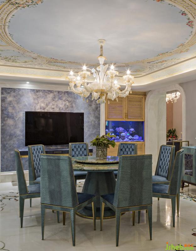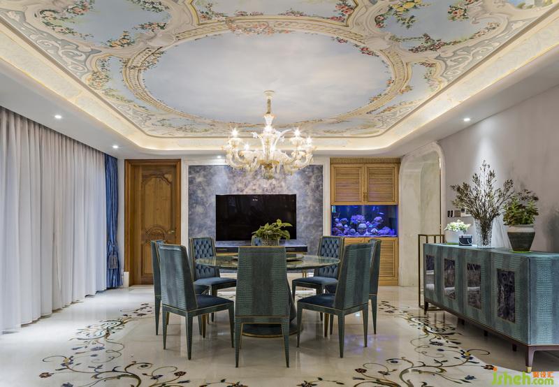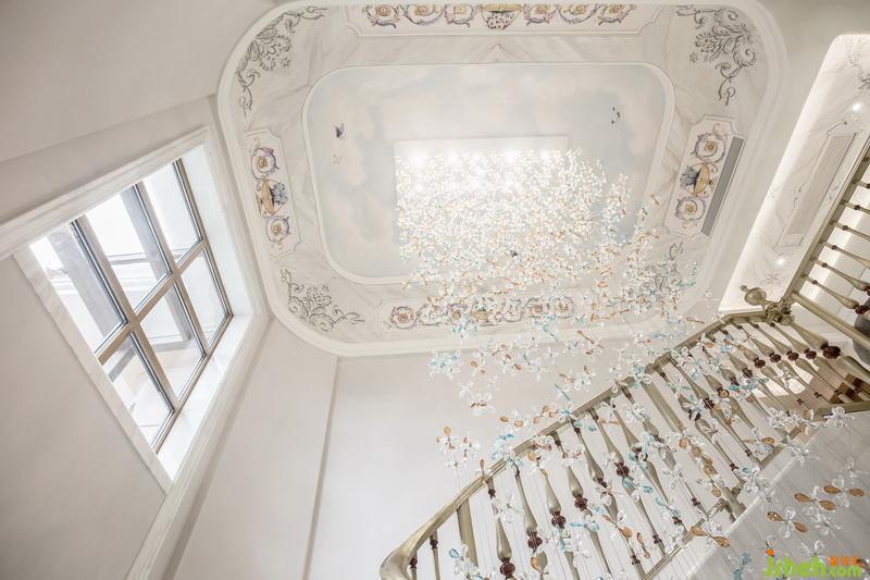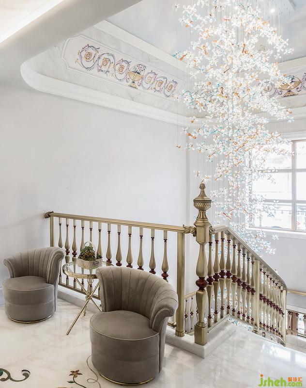 設計師在空間中也運用了眾多“貴族”元素:印花瓷磚,意大利傳承的手繪藝術,唯美精細的藝術天花、旋轉樓梯、大型水晶藝術吊燈等,都將空間渲染的唯美大氣。