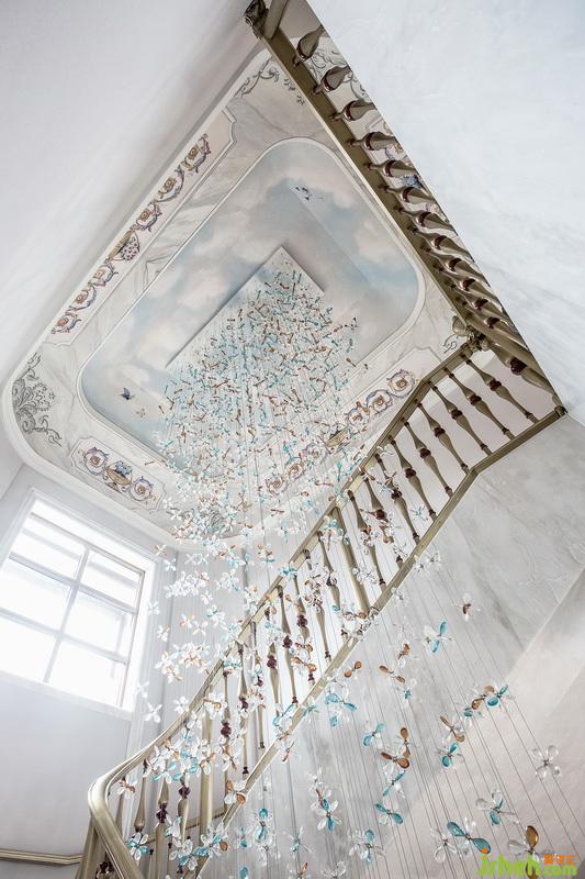 約為10米高的大型藝術水晶吊燈從三樓垂落而下,成為最耀眼的存在,宛如星辰、又如晶瑩雪花,在晨曦夜幕之間,與窗外光芒彼此輝映,揮發(fā)著“一身詩意千尋瀑”的意境。藝術從來不是單一的,而是互相的微妙化學反應。
