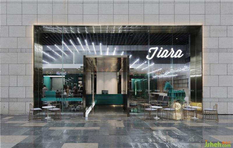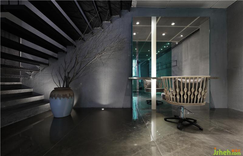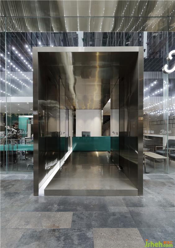 形象門面巧妙的保留原建筑粗獷的火燒面花崗石表面,使用超白玻璃、香檳金不銹鋼等細膩的現(xiàn)代材料,形成強烈的對比,并把入口安置在一個巨大的金屬盒子里;而在摒棄傳統(tǒng)美發(fā)店三色旋轉(zhuǎn)柱標識的同時,挑空區(qū)那片發(fā)絲般飄逸的陣列燈泡,柔化其外觀硬朗的氣質(zhì),讓空間變得立體而又動感,用強烈的視覺感受來體現(xiàn)美發(fā)的行業(yè)屬性。裝修設(shè)計