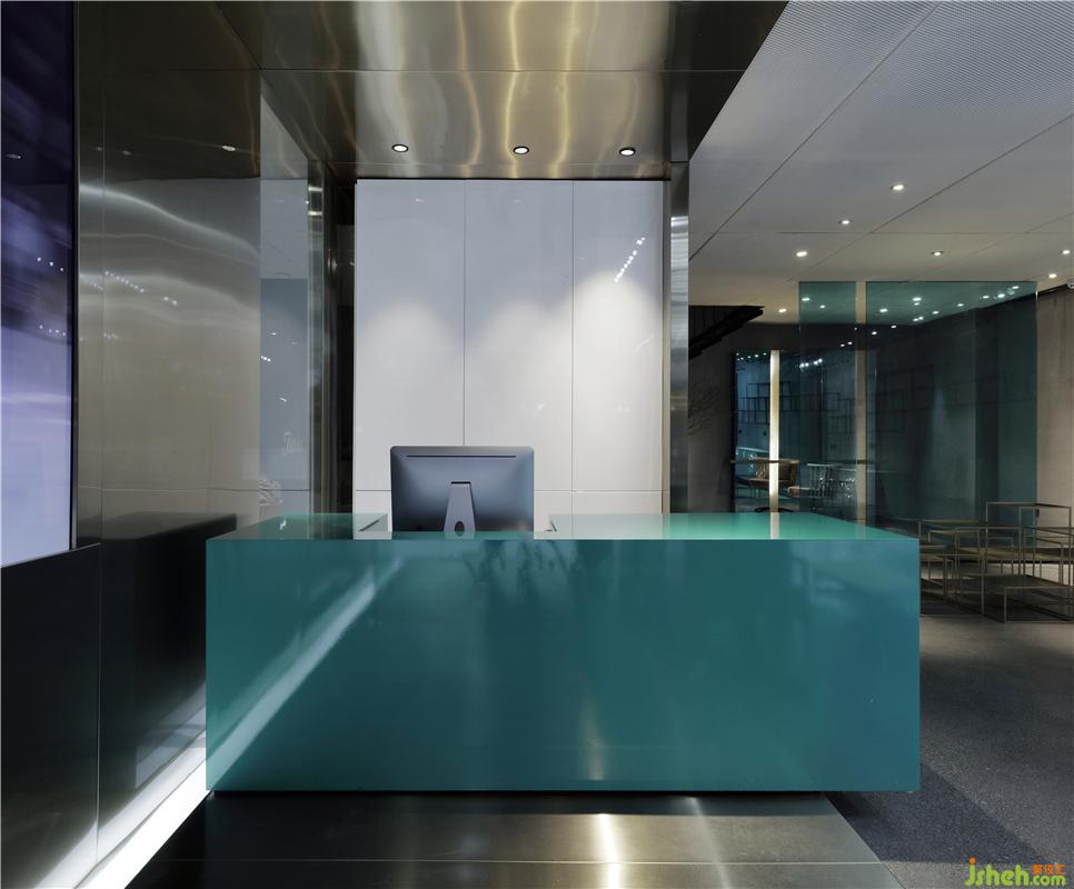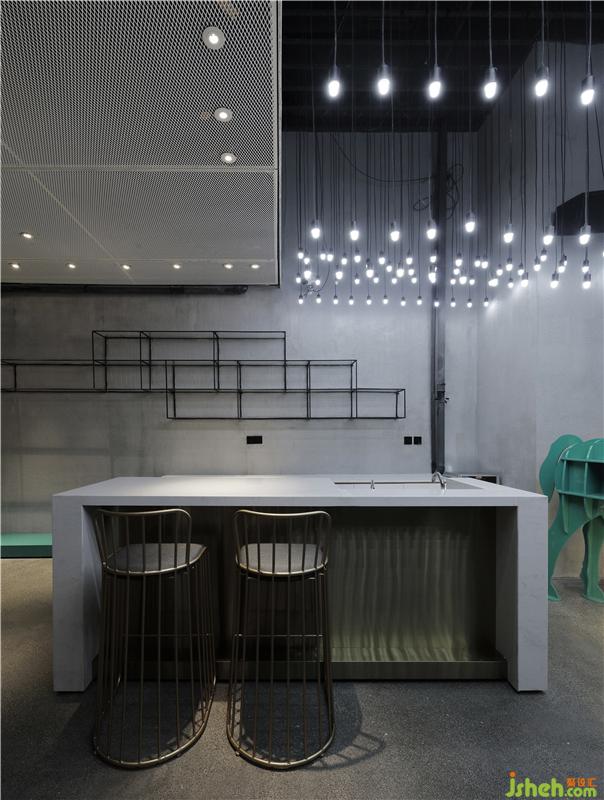 源自于服裝T臺、香檳金不銹鋼包裹的狹窄入口走廊,地面的光帶散發(fā)到金屬板表面的反射,裝修設(shè)計營造出未來時尚科技感的光影,配合著走廊無限播放的時尚秀場畫面和音樂,心情隨之澎湃起來;沿著T臺走到那抹指引動線的蒂芙尼藍極簡收銀臺,轉(zhuǎn)角進入淳樸的休息區(qū)空間,大有桃花源般豁然開朗的感覺。連接各區(qū)域之間的吊頂用鋼板拉伸網(wǎng)材料,把天棚管道線路給掩蓋掉,既延續(xù)了粗獷的質(zhì)感,又流露出對細節(jié)的細膩處理。