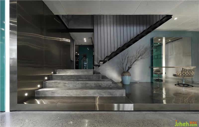 香檳金屬富有強烈的時尚感、水泥代表著工業(yè)粗拙的原始質(zhì)感、蒂芙尼藍用于調(diào)和空間冰冷的色調(diào),經(jīng)過提煉出來的這三種截然不同的材質(zhì)元素演繹著這個時尚美發(fā)空間。裝修設(shè)計