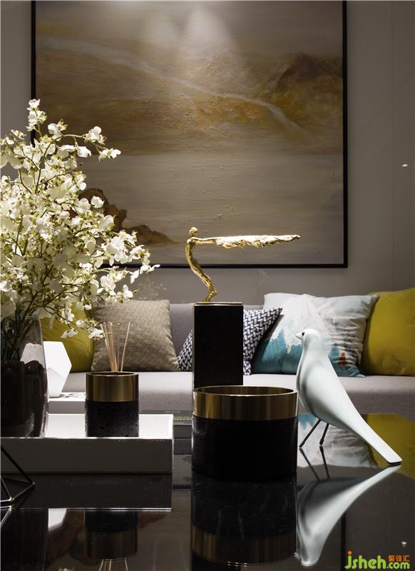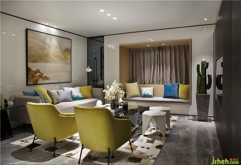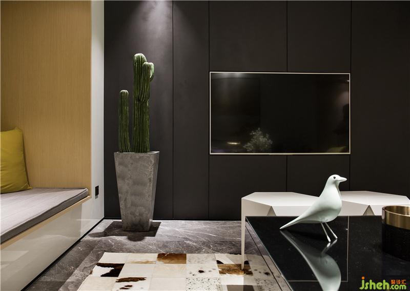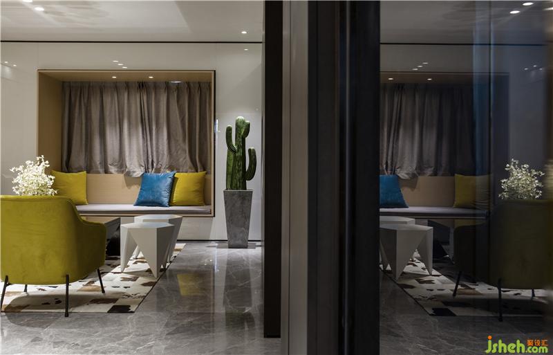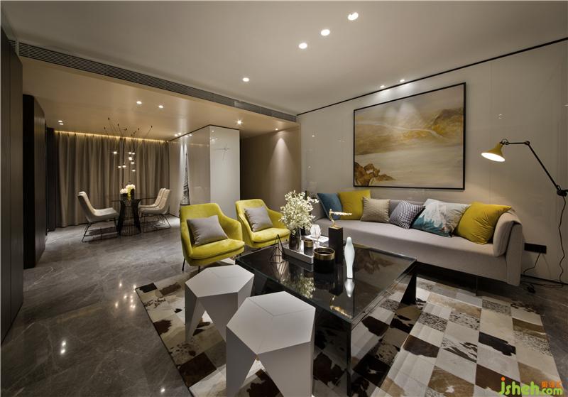 整體空間的動(dòng)靜區(qū)域規(guī)劃分別以黑白色系來區(qū)分。黑色是謐靜,白色是純凈,過分的純粹反而讓空間感覺到冰冷,甚至?xí)钊水a(chǎn)生距離感;而家是有溫度的空間,所以在追求時(shí)尚感的同時(shí),選用代表著希望和朝氣的黃色系,對(duì)空間環(huán)境進(jìn)行調(diào)劑。樣板房設(shè)計(jì)