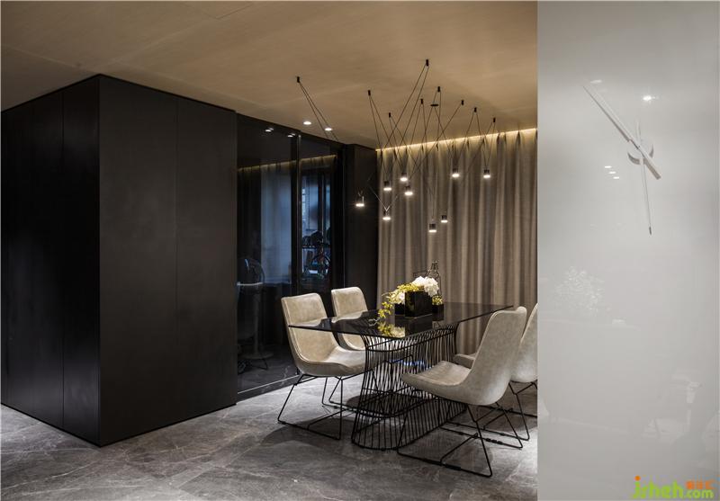 踏入玄關(guān),土耳其灰大理石的地面延伸至公共區(qū)域,走廊兩側(cè)在滿足儲(chǔ)物功能需求的前提下,表面全部用黑色填滿,目的是讓人的心情迅速的平靜下來;而天棚上那一抹溫潤(rùn)的木色把視線指引到更光明的地方,慰藉著疲憊的身心。樣板房設(shè)計(jì)