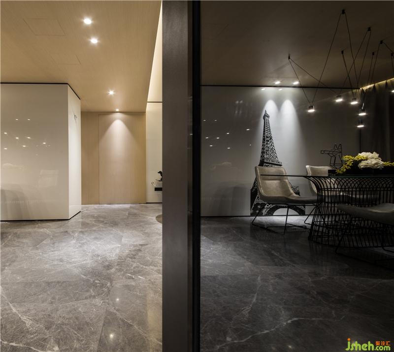 主要材料:白色微晶石、黑色亞光烤漆板、橡木飾面、土耳其灰大理石、灰鏡