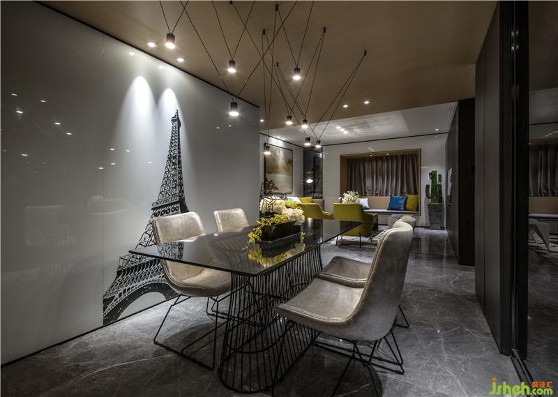 餐廳與公衛(wèi)的隔墻,巧妙的形成一個(gè)白色的立方體,猶如雕塑般屹立在整個(gè)活動(dòng)空間;立方體上的黑色埃菲爾鐵塔圖案,那是對(duì)時(shí)尚之都的向往,倚在餐廳的椅子上喝杯紅茶,就仿佛身在香榭麗舍大道,流露出一絲絲浪漫的氣息。