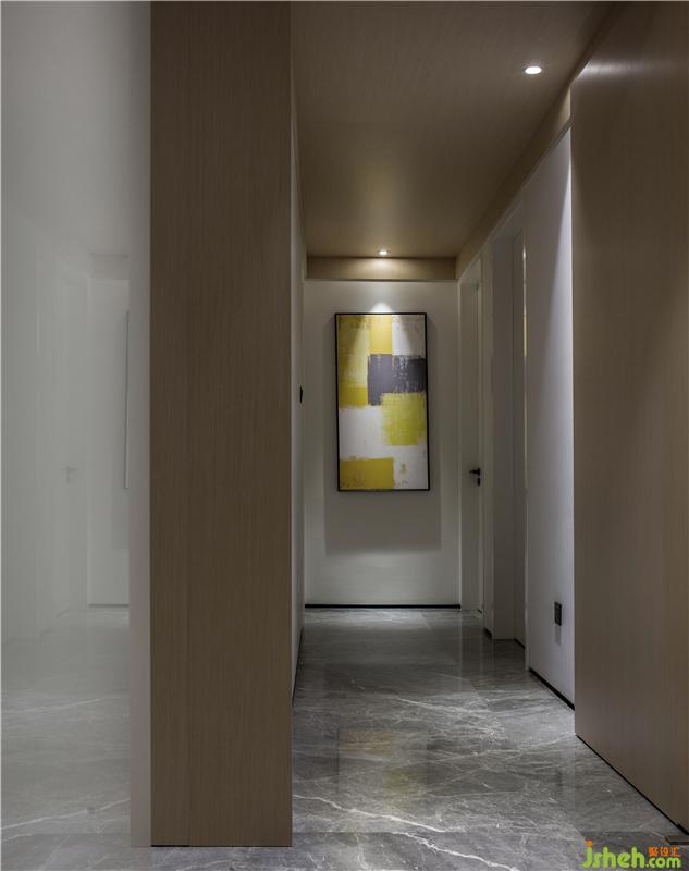 推開那扇隱形的木門,后面是平和舒適的居住區(qū)。狹長(zhǎng)的通道連接著三個(gè)居住空間,每個(gè)居住空間均以白色和木色這兩種最為純凈的顏色進(jìn)行演繹;唯一不同的是,每個(gè)空間都有與其對(duì)應(yīng)的性格顏色畫作來(lái)作為居住者的標(biāo)識(shí),女孩房選用枚紅色、男孩房選用淺藍(lán)色、而主人房則為五彩繽紛的顏色,這也是寄予每位居住者的一種期許。樣板房設(shè)計(jì)