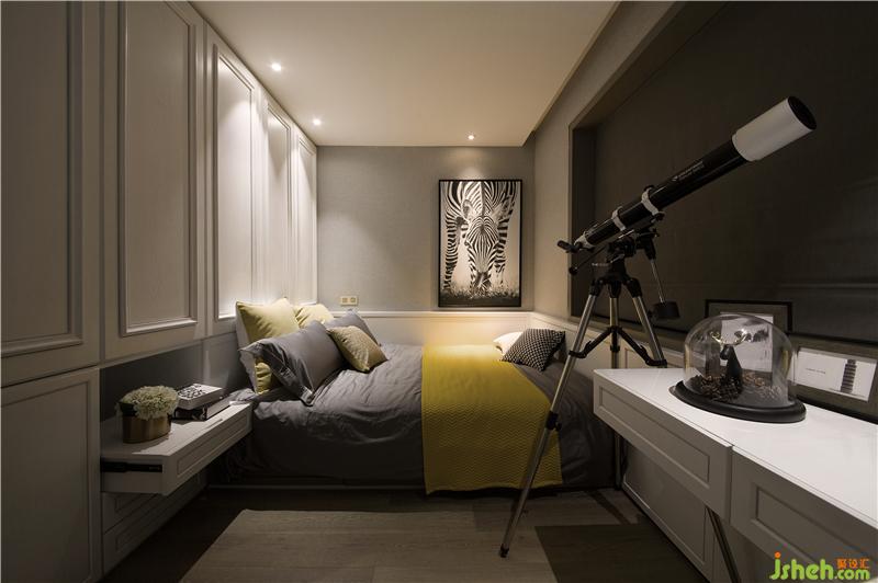 通過一條狹長昏暗的走廊,連接著長輩房、男孩房、女孩房和主人房。四個(gè)房間的基礎(chǔ)格調(diào)依然延續(xù)著客廳的風(fēng)格,在色調(diào)跟軟裝的搭配,根據(jù)每位使用者的興趣、愛好和性格做了局部調(diào)整,既滿足個(gè)人性格需求,又保持了風(fēng)格的完整性。