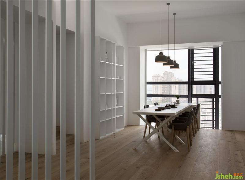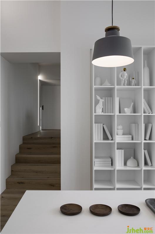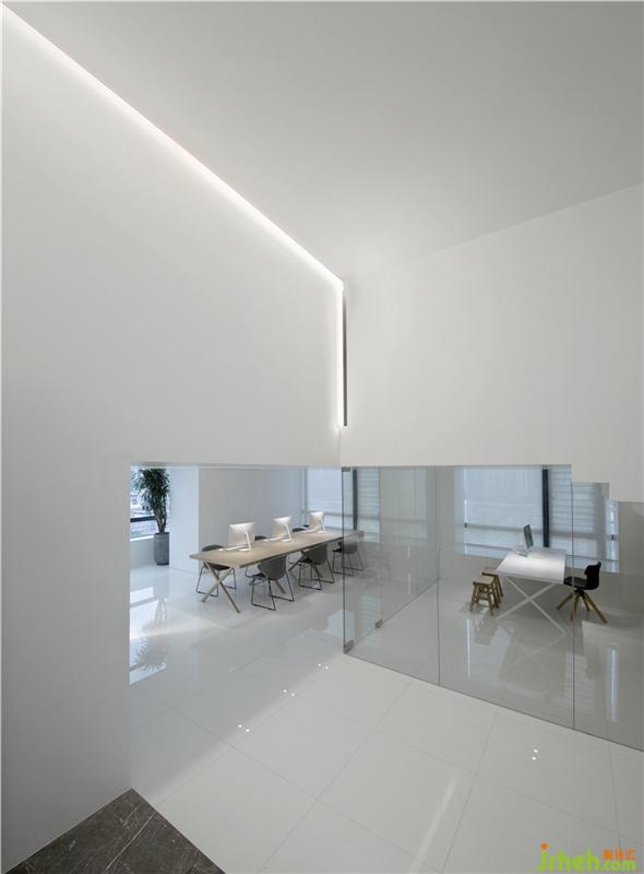 右邊的空間是一個(gè)完全通透純白的空間,視覺中心是一個(gè)多功能的木盒子,它是空間擠壓的產(chǎn)物;原本是三個(gè)獨(dú)立空間打通成一個(gè)空間,暴露出結(jié)構(gòu)吊頂?shù)膬筛蟪兄亓?,這讓每個(gè)功能區(qū)的空間比例受到限制。辦公室設(shè)計(jì)