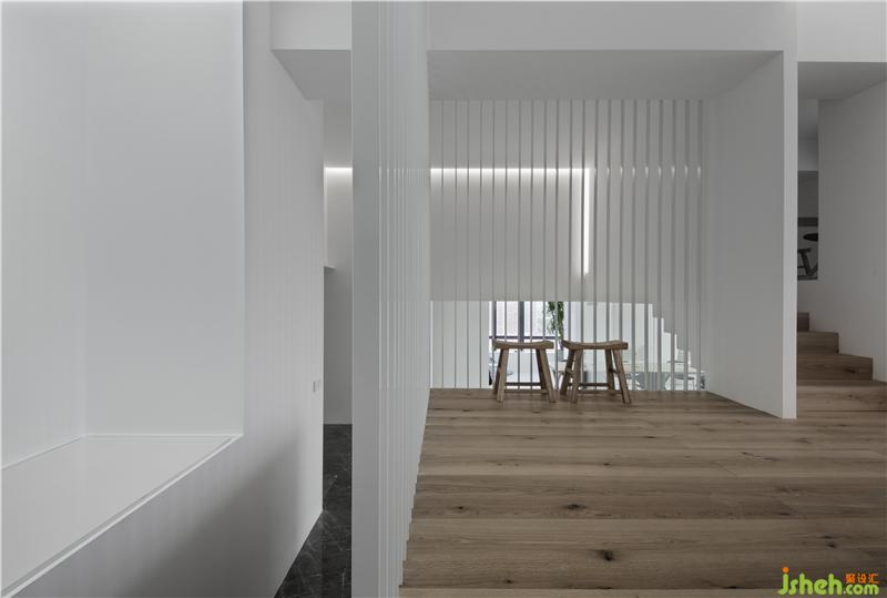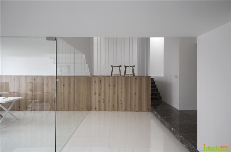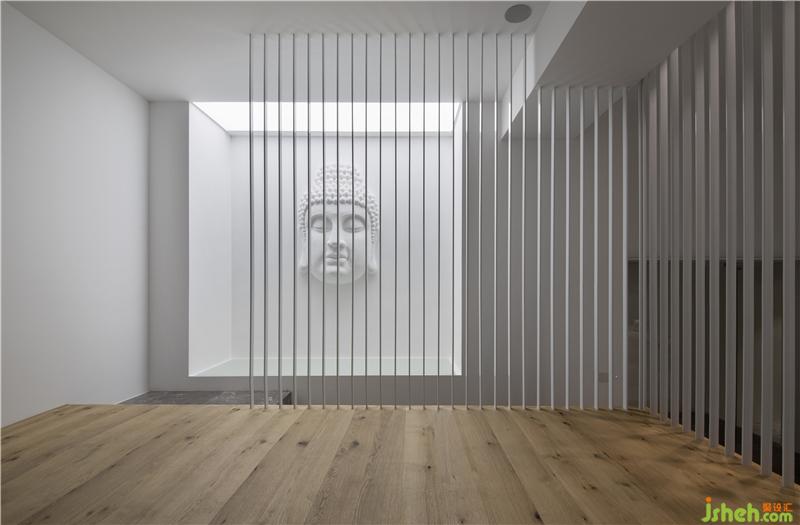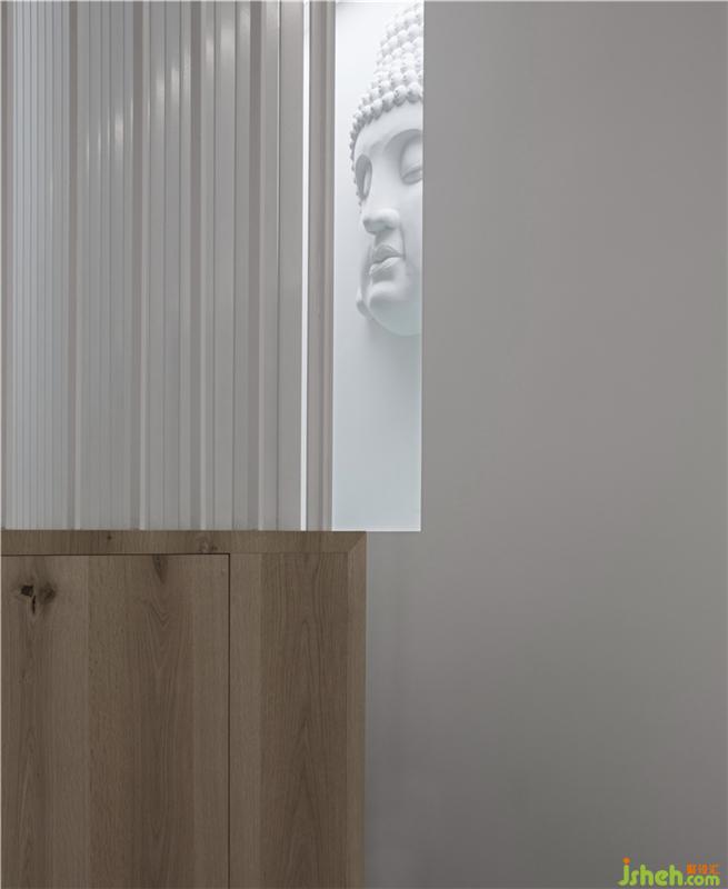 經(jīng)過反復(fù)驗(yàn)證,把洽談和會(huì)議功能這個(gè)區(qū)域的地面高度降低,形成一個(gè)中轉(zhuǎn)平臺(tái),并把所有的收納功能集合在這個(gè)盒子內(nèi),用原木包裹,形成空間的樞紐中心;為了保證隱私、通風(fēng)采光及安全,盒子的圍擋采用矩管格柵的形式,通過格柵觀看樓梯邊的佛像及樓梯下行走的人,會(huì)讓平靜的空間產(chǎn)生互動(dòng)的波瀾。在二樓挑空的墻體上的那條縫,也是起到采光通風(fēng)的作用,并避免視覺上的擁堵。辦公室設(shè)計(jì)