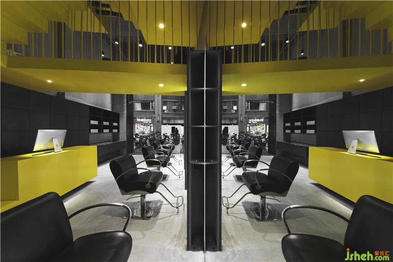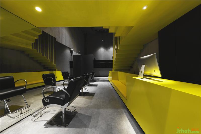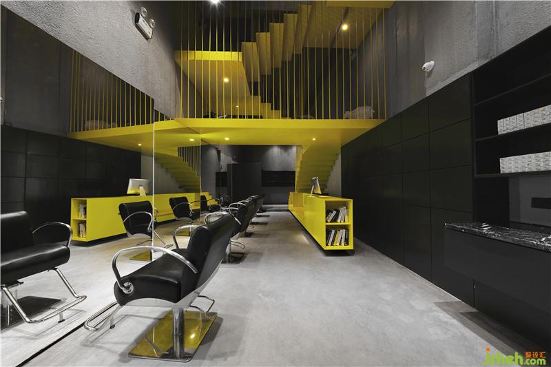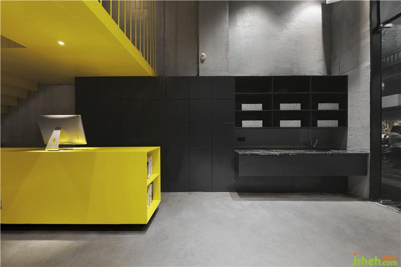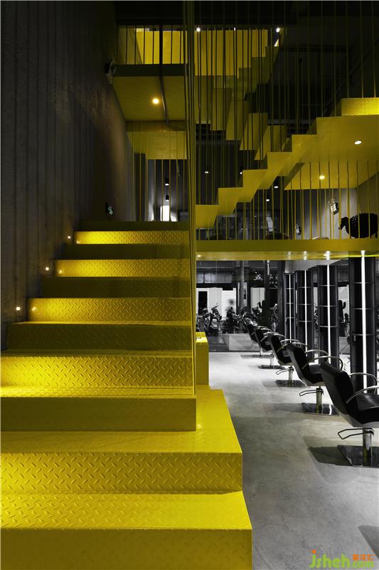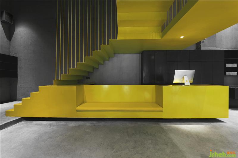 黑+黃是非常經(jīng)典的顏色搭配,實際運用在生活中的各種場景,既有時尚意味又有強烈的視覺沖擊力。于是,所有功能性的器物、墻面、地面、頂面都為黑灰色,而樓梯裝置則刷成了黃色。沒有特意多余的造型堆砌、用最基礎(chǔ)的結(jié)構(gòu),通過顏色的對比,把樓梯的裝置感體現(xiàn)出來,成為空間視覺焦點。裝修設(shè)計