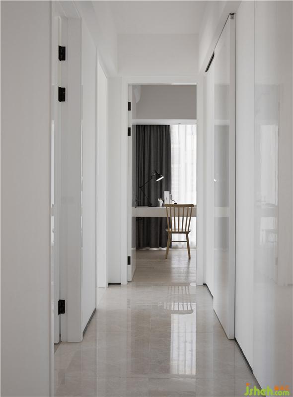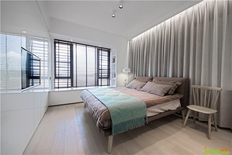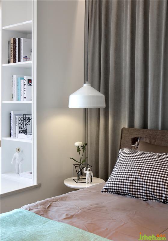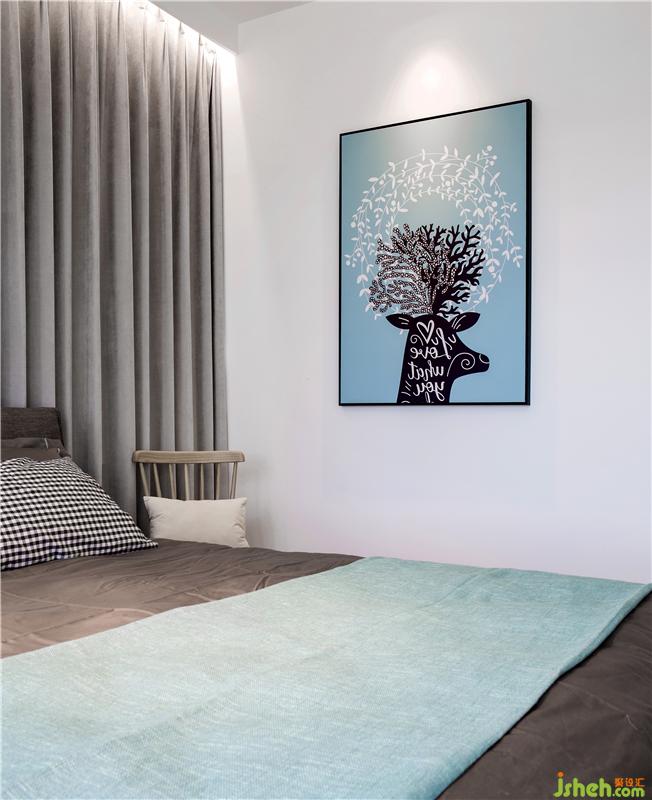 兒童房除了兩個孩子的上下床以外,還隱藏著第三張床,以便親屬臨時住宿使用;三個房間共用衛(wèi)生間的自然采光是通過兒童房的一條磨砂玻璃,打破了黑暗無光的沉悶;主臥采取了北歐隨意的擺設方式,床后面一堵柔軟的窗簾延伸了視覺,一把溫莎椅隨意的擺放在床頭,當成床頭柜在使用,而拉開了窗簾,后面是一個隱藏的書桌,椅子往后一擺,便是一個獨立的書房空間和梳妝臺功能。室內設計師