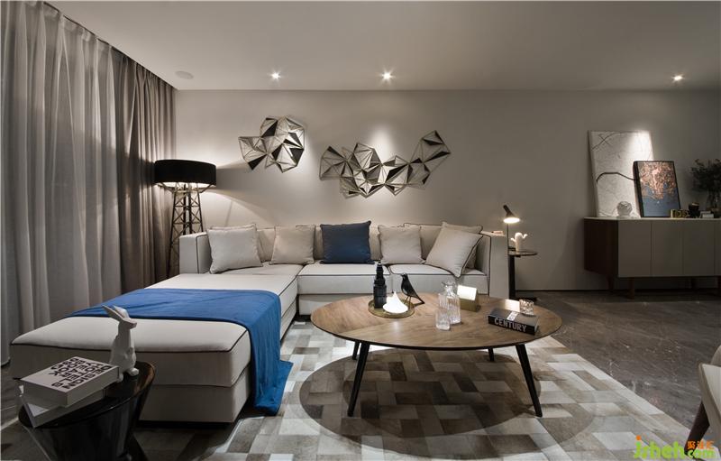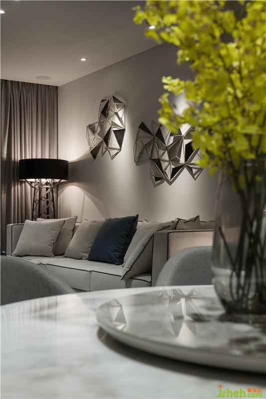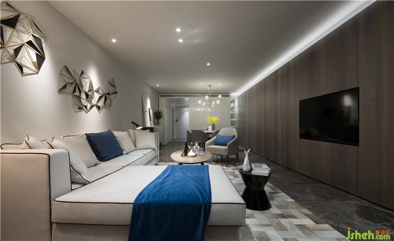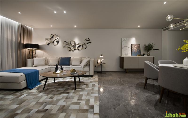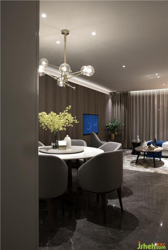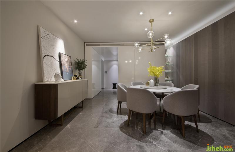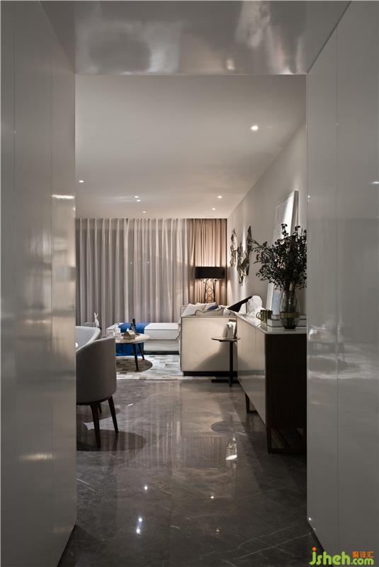 以電視墻隔開活動區(qū)和休息區(qū),為了增大活動區(qū)的視覺空間,活動區(qū)的門全部以隱藏的形式。從客廳往廚房方向看,玄關和廚房融為一體,形成一個白色的盒子,成了這個空間的視覺焦點,而活動區(qū)的所有空調(diào)設備全部隱藏在白色盒子內(nèi),最大限度的抬高客廳及餐廳的層高,避免壓抑。電視背景墻與休息區(qū)入門及餐廳背景墻做成一體,讓活動區(qū)更加整體。室內(nèi)設計師