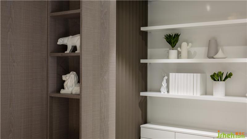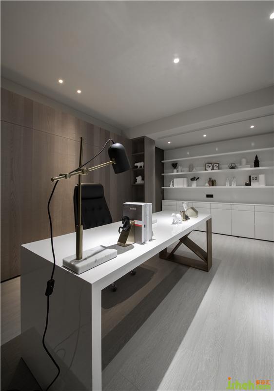 主臥的對面是書房兼客房,整墻的書架滿足了主人的收藏容量;書桌后面是隱藏床和衣柜,這是給至親的家人預留的客房空間。