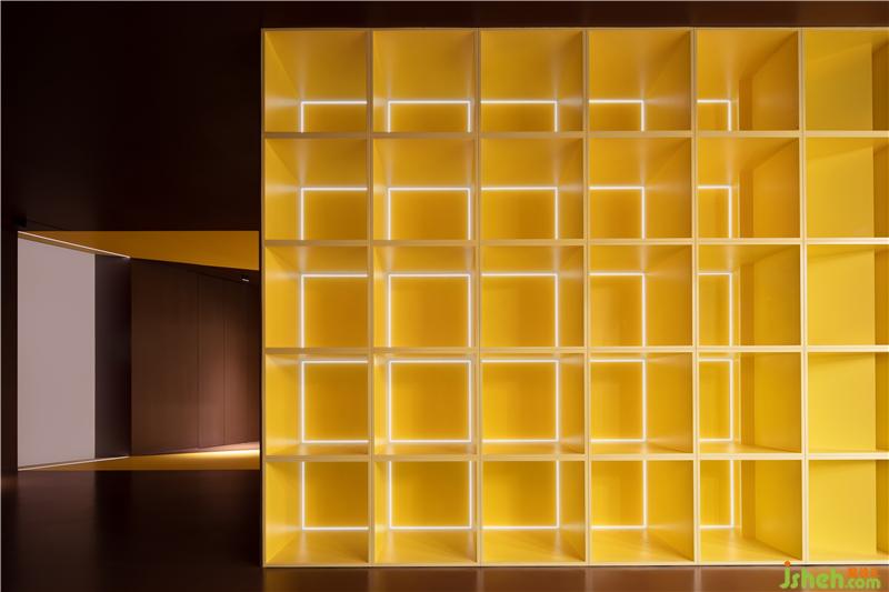 Light ignites space with magic. A wall with the outline of a large square is divided into grids of different sizes by the angle of light rays. It creates a visual sense of light and dark, virtual and real, while at the same time enriching the space and clarifying the theme.