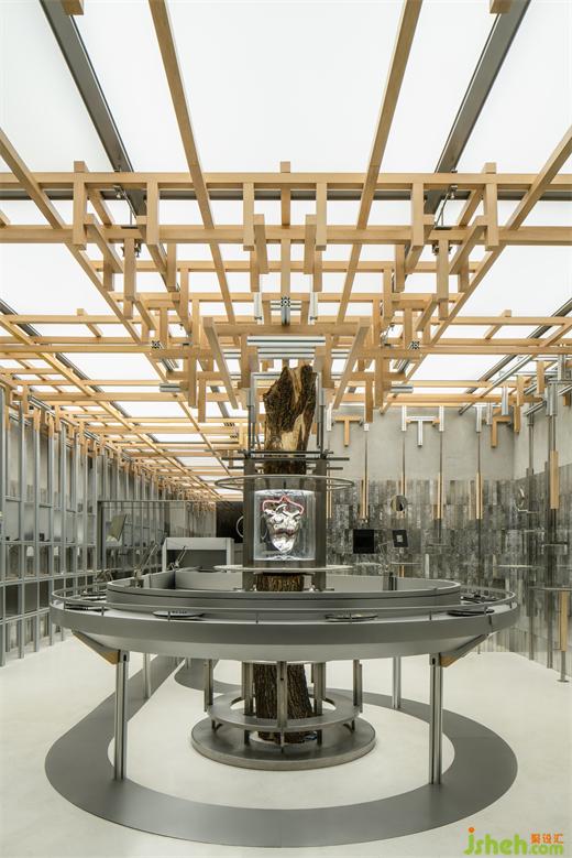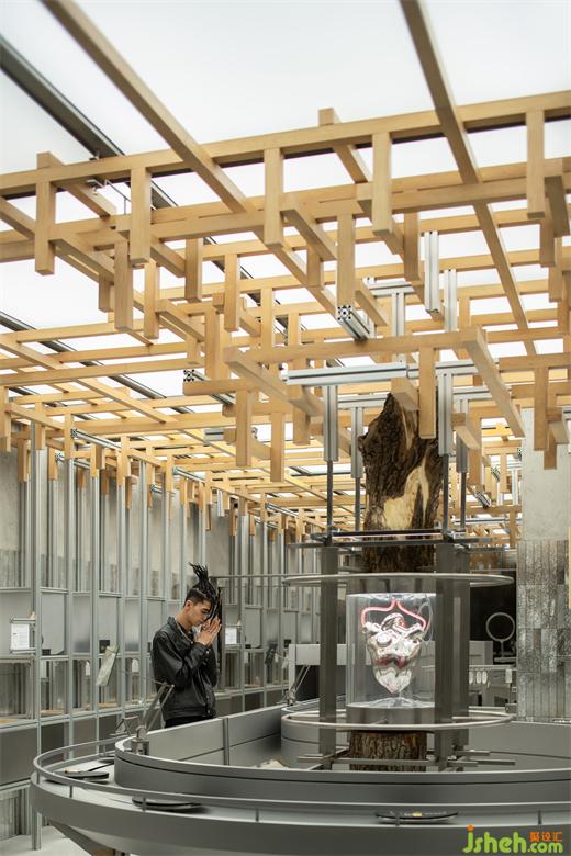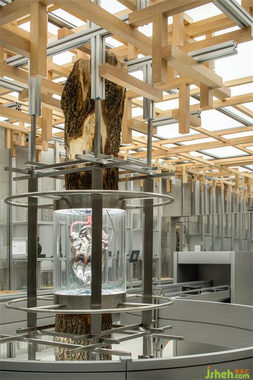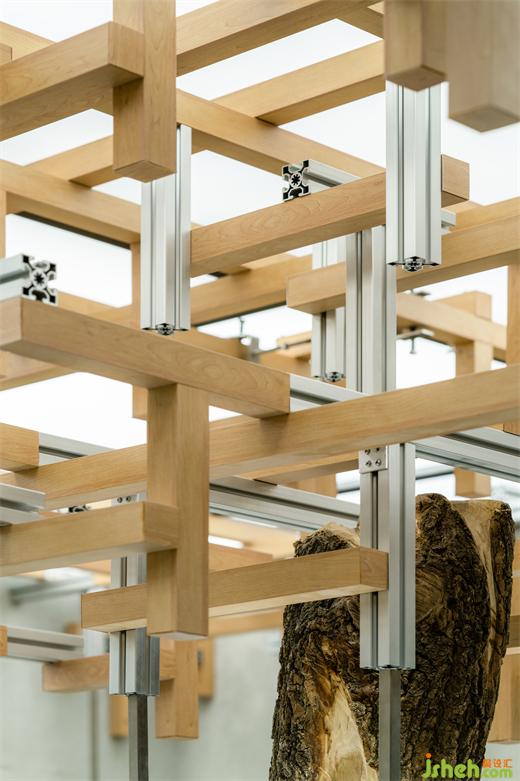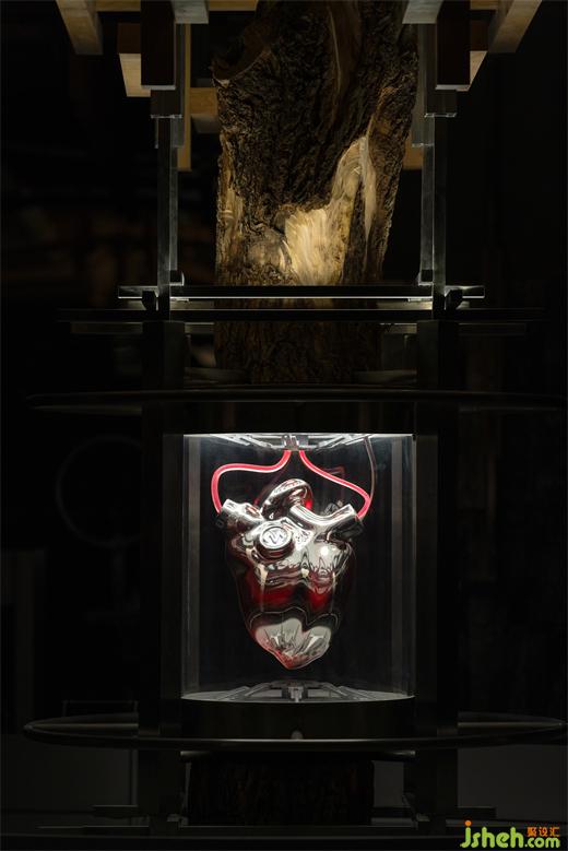 沿核心裝置縱伸向上,模擬樹木枝干的生長姿態(tài),金屬與木質(zhì)材料通過構(gòu)件連接的方式,蔓延至天花頂部,仿佛通過接收心臟所賦予的“能量”,在有限的空間中,無限生長。