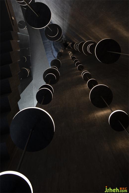 如:展廳一角的磚貼面的圓盤燈,它們以散落的獨(dú)立個(gè)體集結(jié)成章,有序串聯(lián)成流動的圓盤燈束,由挑空的穹頂傾瀉而下,瀲滟了整個(gè)原生態(tài)的空間氛圍。