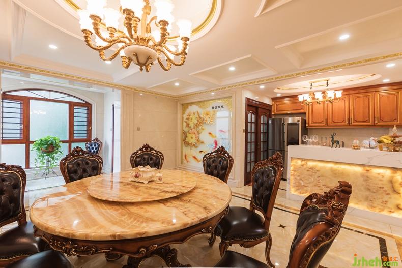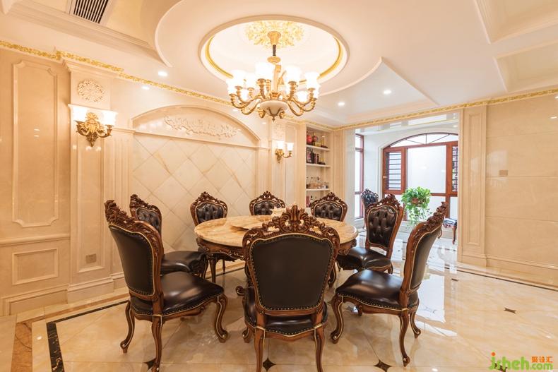 一樓設(shè)計(jì)了一個(gè)中廚和西廚,餐廳,餐廳用了花開富貴為主題的玉雕,采用大量的大理石和玉石,和描金來鋪墊或做點(diǎn)綴,以新古典奢華風(fēng)格演繹空間結(jié)構(gòu),在客廳用了大理石,玉石,做出漂亮,有藝術(shù)性的背景,盡顯奢華。在客廳的偏廳中的小陽臺做了一個(gè)品茶區(qū),滿足了業(yè)主日常生活情趣愛好??蛷d整體空間色調(diào)以暖色為主,用米黃色做基調(diào),而家居以深色為主,點(diǎn)綴金色的線條,整體上存在協(xié)調(diào)感,呈現(xiàn)出溫馨舒適的感覺。室內(nèi)設(shè)計(jì)師
