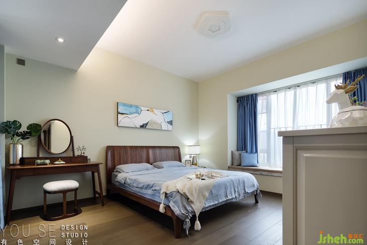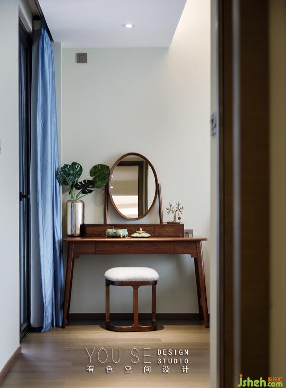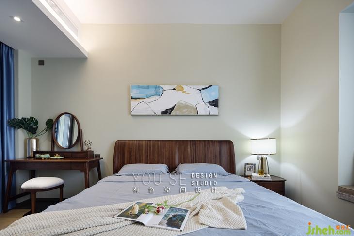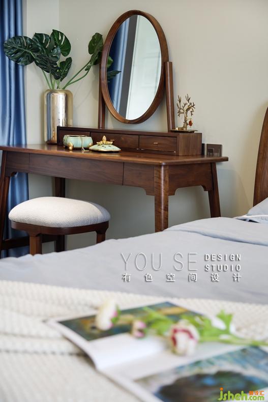 臥室也是走的簡(jiǎn)約風(fēng),同樣采用胡桃木的床架,配合簡(jiǎn)約的床品,比較獨(dú)特的是這個(gè)胡桃木質(zhì)的梳妝臺(tái),橢圓色的鏡面,繁復(fù)花紋的配飾盒,又有了種復(fù)古的感覺。