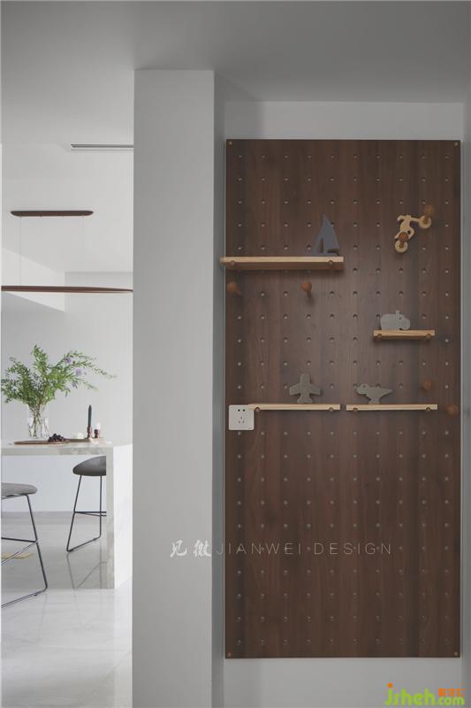過道的墻面裝上洞洞板,可以隨意調(diào)配掛件與層板,很不錯的收納設(shè)計(jì)。