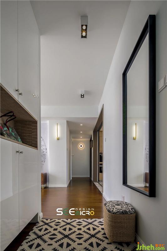 玄關簡潔寬敞;一整面鏡子既能滿足穿衣鏡的使用又能使整個空間得到完美的延伸。面與面造型呼應和諧統(tǒng)一;過道盡頭的壁燈與客廳的壁燈交相呼應,使整個空間都亮了起來,一眼望去貫穿整個過道,起到了畫龍點睛之筆。