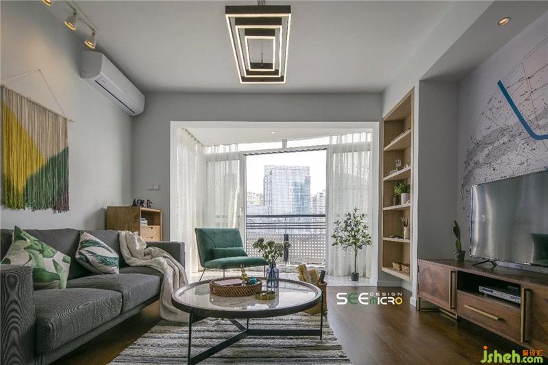 客廳以灰色、白色、原木色相互交匯,色彩清馨、明亮、融洽、韻律;祖母綠絨布單人沙發(fā)的點綴打破客廳原本的靜謐,突顯空間層次及延展至趣味陽臺。富有科技感的電視背景墻畫,帶你感知世界。裝修設計