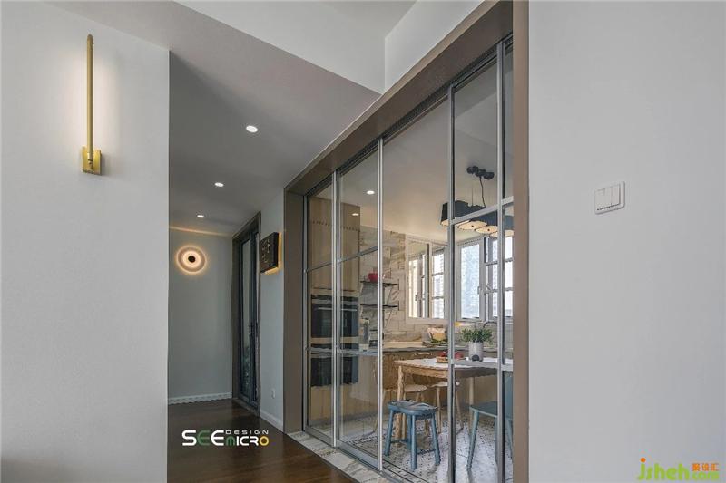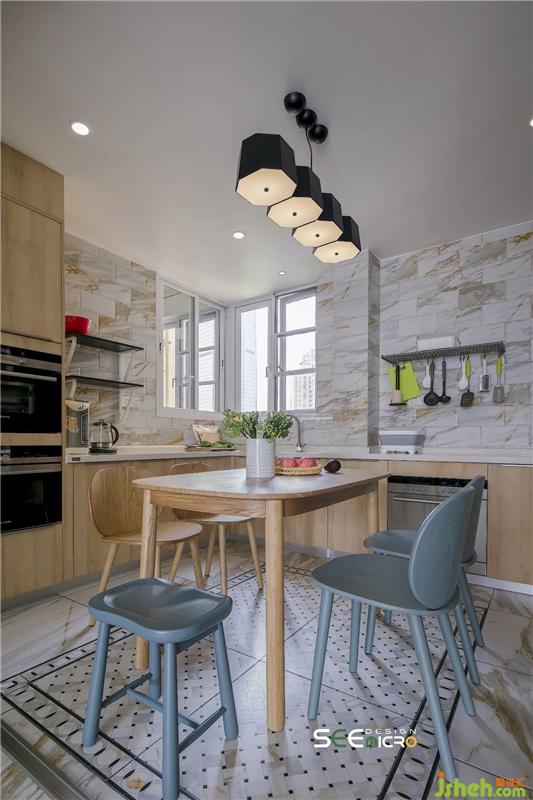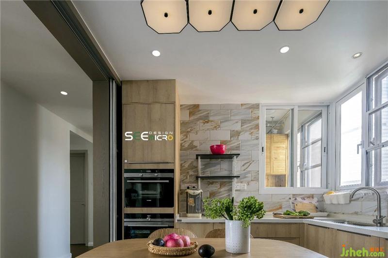 原本要通過生活陽臺(tái)間接采光的小廚房,被設(shè)計(jì)師重新構(gòu)造,餐廳廚房和為一體。簡(jiǎn)潔而實(shí)用的木紋餐桌椅,舒適而自然,給空間賦予木質(zhì)的溫暖;借由廚房玻璃推拉門的設(shè)計(jì),空氣的流通和光線的補(bǔ)充得到很好的解決。民以食為天,擁有大的開放式廚房不是夢(mèng)。