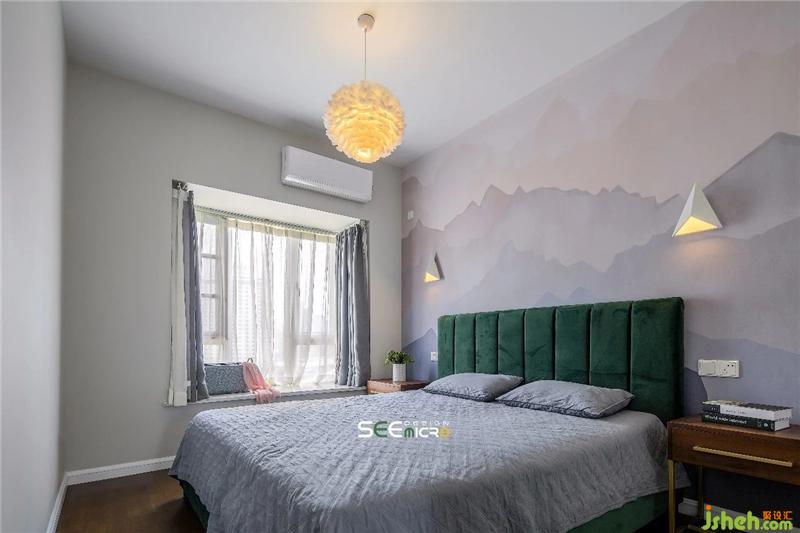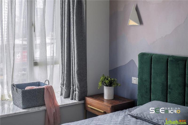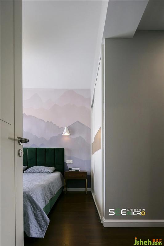 主臥運用風景畫背景墻及祖母綠色絨布的面料營造溫暖而時尚的都市生活方式,有種賞心悅目的愉悅感。日光的照射下,讓穿透性完全延伸到極致,給平靜、優(yōu)雅、舒適的臥室空間構(gòu)成了純凈的靈魂空間平添一種自由輕松的氛圍。裝修設(shè)計