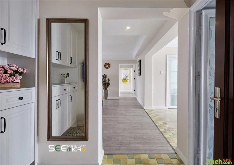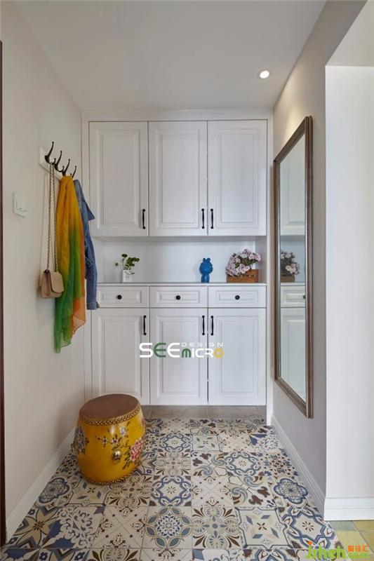 門廳以白色為主色調(diào),上下并行的儲(chǔ)物柜、觸手可及的掛衣鉤與整裝必備的穿衣鏡一應(yīng)俱全。跳色的花紋陶瓷鼓凳功能性與觀賞性兼具,一襲甄選的印花地磚則將民族文藝風(fēng)合宜地嵌入整個(gè)空間格局中。