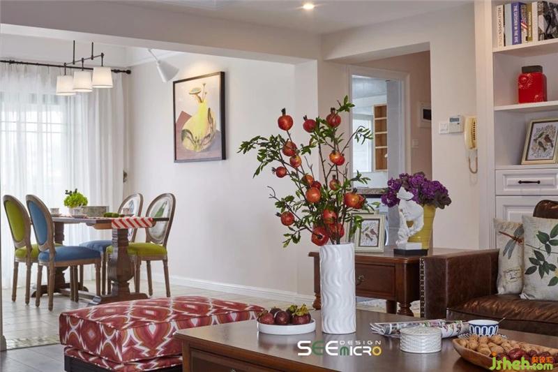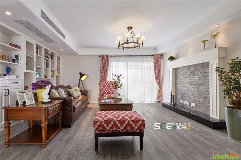 美式鄉(xiāng)村風(fēng)吊燈下,是實(shí)用舒適的一桌、一椅、一沙發(fā),選色或沉穩(wěn)、或明艷,與空間底色形成對(duì)比,單人位沙發(fā)印花則與窗簾相互輝映。沙發(fā)背后是一整面白色儲(chǔ)物柜,滿足主人收納需求的同時(shí),又可擺放幾件工藝品點(diǎn)綴空間。簡約的壁爐選用與木質(zhì)地板同色系紋理的文化石鋪貼而成,素雅精致。裝修設(shè)計(jì)