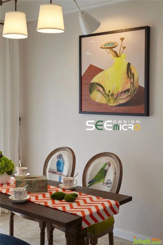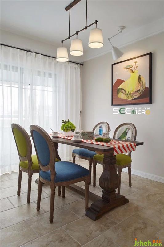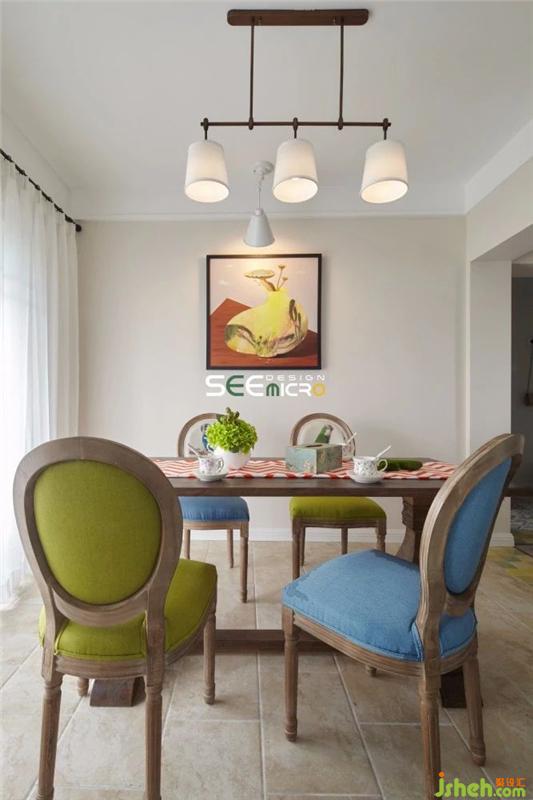 餐廳設(shè)于落地窗邊,保證了空間的采光與通透性。美式實(shí)木長餐桌給人以穩(wěn)重敦實(shí)之感,巧妙的是,綠、藍(lán)兩色餐椅的選擇恰到好處地將焦點(diǎn)轉(zhuǎn)移,半透明的窗紗則以其輕盈質(zhì)感與餐桌形成對比,營造出一個清新舒適的用餐環(huán)境。墻上一幅暖色系藝術(shù)畫“如意”與簡約的鐵藝美式吊燈則將空間視線縱向拉升。裝修設(shè)計