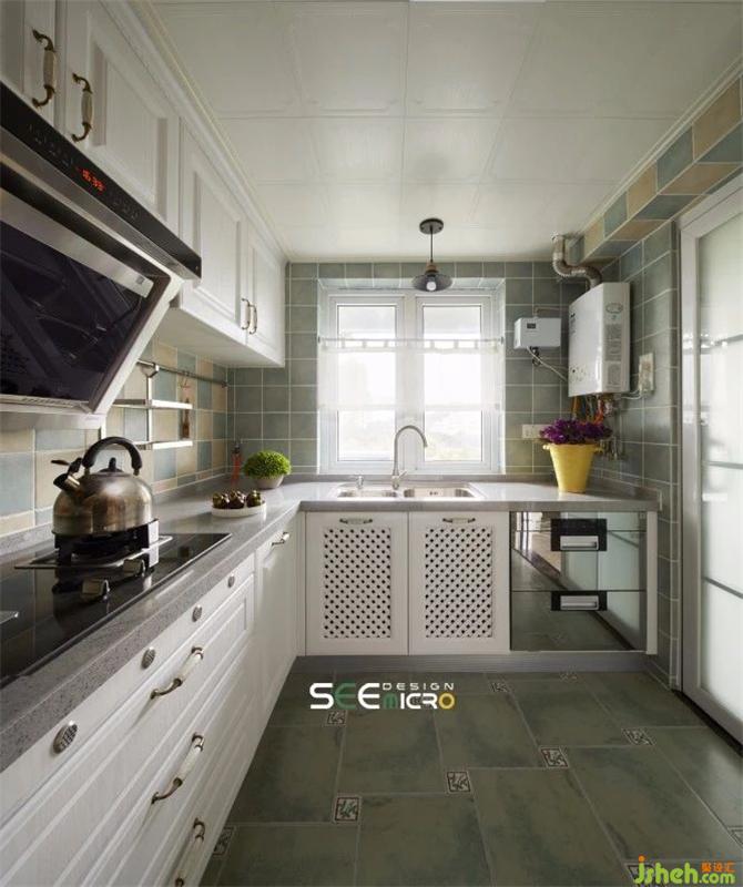 廚房以純白、墨綠二色奠定基調(diào),整體空間一目了然,給人以潔凈的清爽感。U型櫥柜的選擇能夠在兩面相連的墻之間劃分工作區(qū)域,每個作業(yè)區(qū)都留有操作臺面,大大減少了廚房慣有的擁擠感。復(fù)古瓷磚的錯落拼貼為廚房平添了一種文藝氣息,實(shí)際上深色系的瓷磚更易于日常打理。裝修設(shè)計