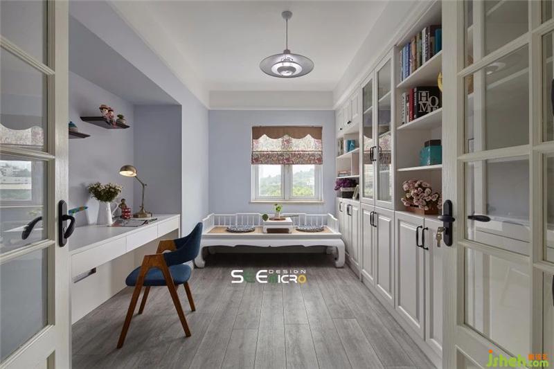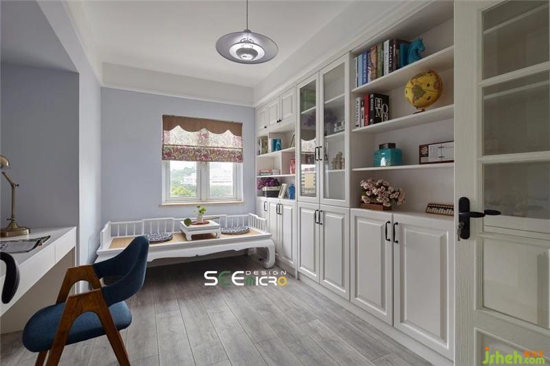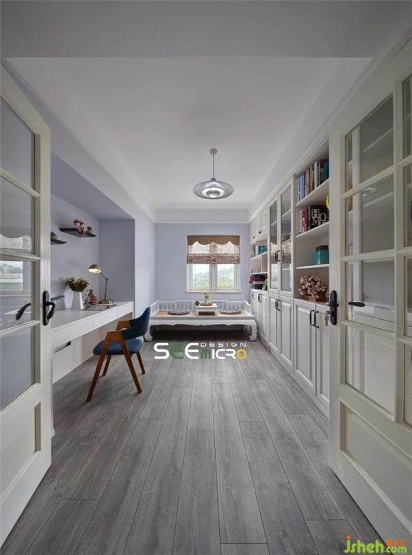 沿承其他空間區(qū)域的清新色調(diào),設(shè)計師以整面的素白書柜與淺藍(lán)色的墻壁將整個書房處理得更加通透。長條形木質(zhì)地板將視覺空間往里延伸,盡頭的羅漢床上以一個蓮蓬、兩席蒲團(tuán)營造出簡約而不簡單的幾許禪意,半掩的窗則最大限度的為書房引進(jìn)了自然光。