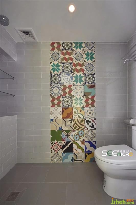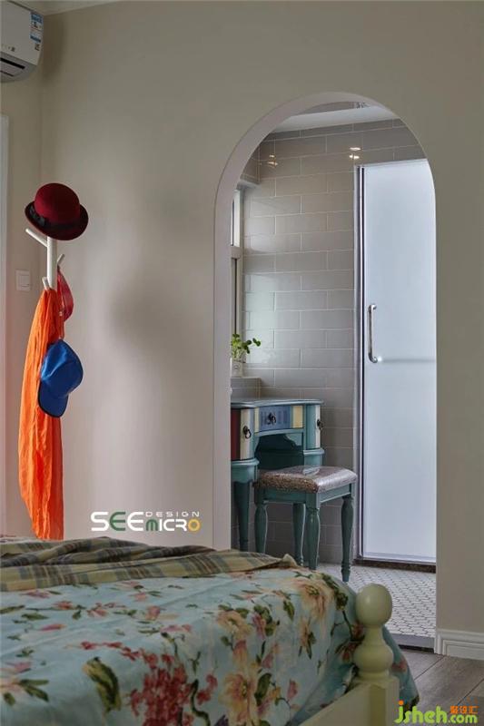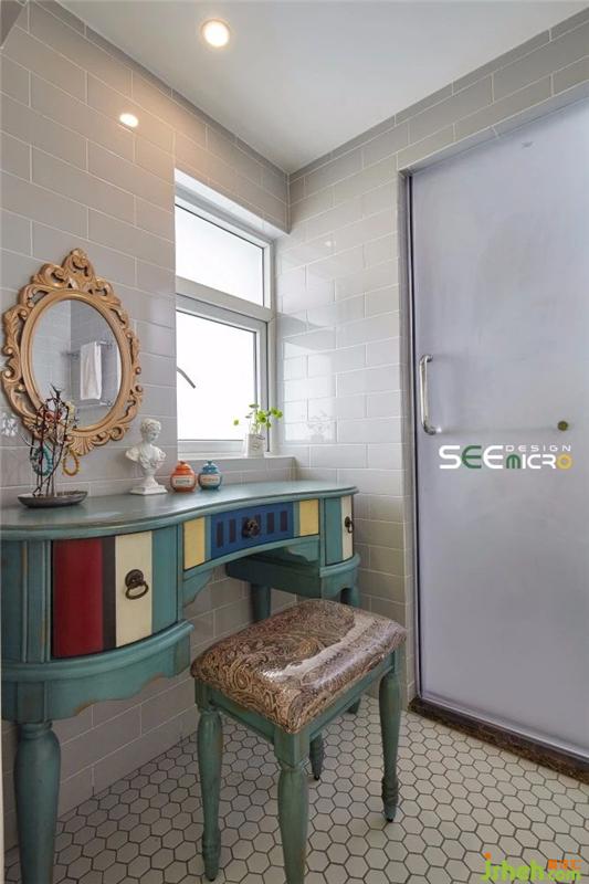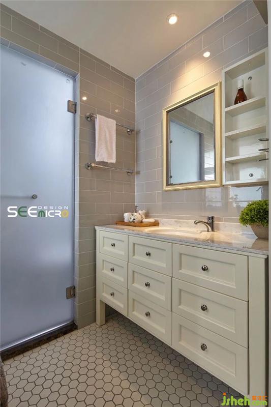 從主臥的一扇拱門進(jìn)去便是主衛(wèi)所在之處,主衛(wèi)做了干濕分區(qū),外面是美式風(fēng)格飽滿的梳妝臺(tái)與洗漱區(qū),里面是沖涼區(qū),中間以一扇磨砂玻璃門做隔斷。主衛(wèi)干區(qū)一改其他區(qū)域的大塊地磚,選用六邊形馬賽克瓷磚使整個(gè)空間美感升級(jí);推開磨砂玻璃門進(jìn)入濕區(qū),則可見到一面不規(guī)則鋪貼的花磚,藝術(shù)感十足。裝修設(shè)計(jì)