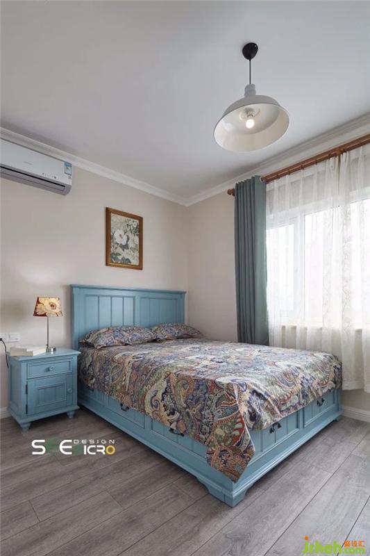 主人母親鐘情藍(lán)色,特意選了一張湛藍(lán)的美式大床,與邊上床頭柜為同一色系,搭上一襲民族風(fēng)印花床單,自成一景。帶抽屜的大床不僅美觀,且能夠滿足儲(chǔ)物需求,夏日到了便可將棉被等物件收納起來。床頭柜上的花色燈罩與墻上的壁畫主體相互呼應(yīng),無意間便點(diǎn)綴了視覺空間。